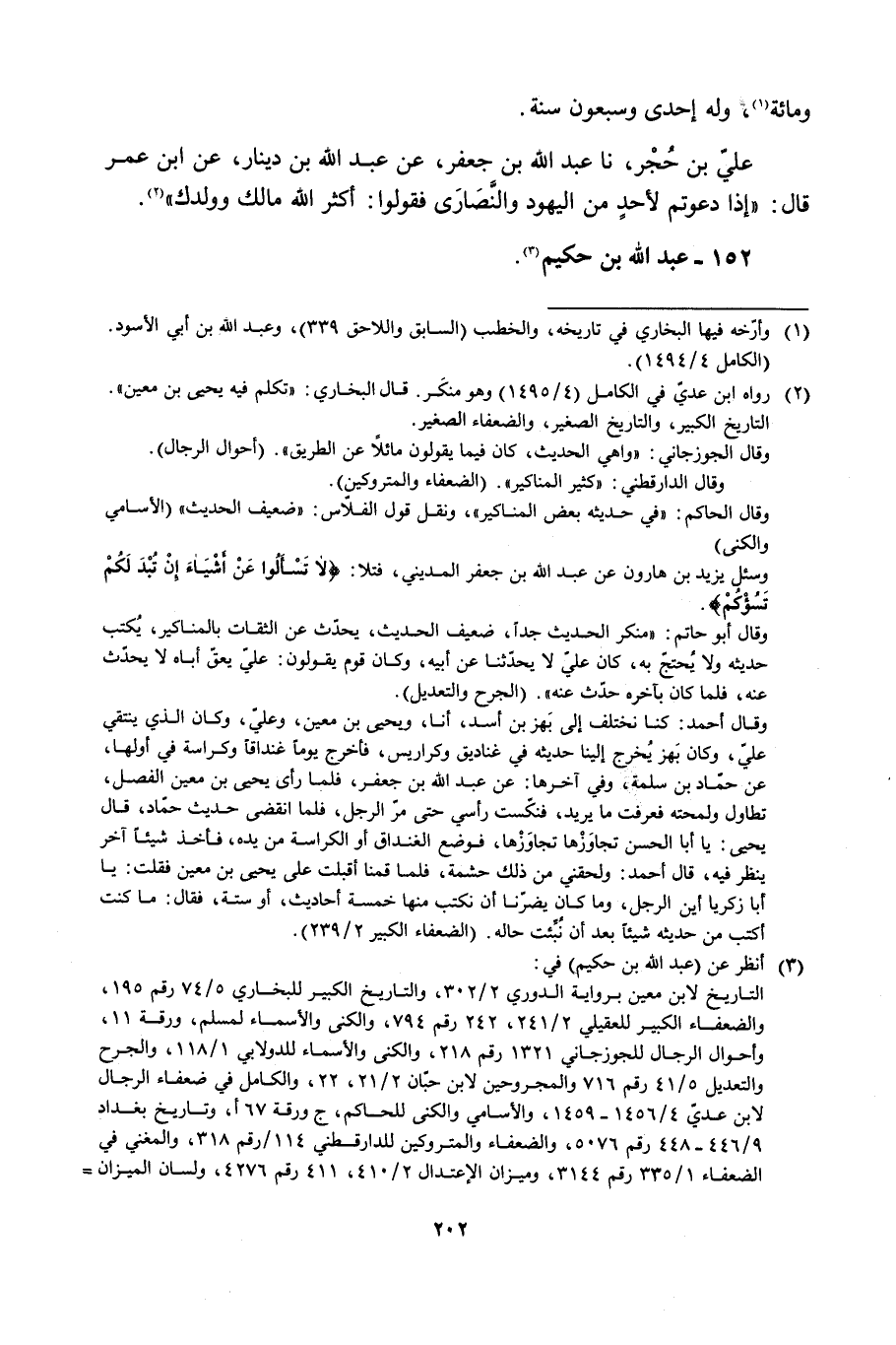 عَلِيُّ بْنُ حُجْرٍ، نَا عَبْدُ اللَّهِ بْنُ جَعْفَرٍ، عَنْ عَبْدِ اللَّهِ بْنِ دِينَارٍ، عَنِ ابْنِ عُمَرَ قَالَ: «إِذَا دَعَوْتُمْ لِأَحَدٍ مِنَ الْيَهُودِ وَالنَّصَارَى فَقُولُوا: أَكْثَرَ اللَّهُ مَالَكَ وَوَلَدَكَ» [2] . 152- عَبْدُ اللَّهِ بن حكيم [3] .