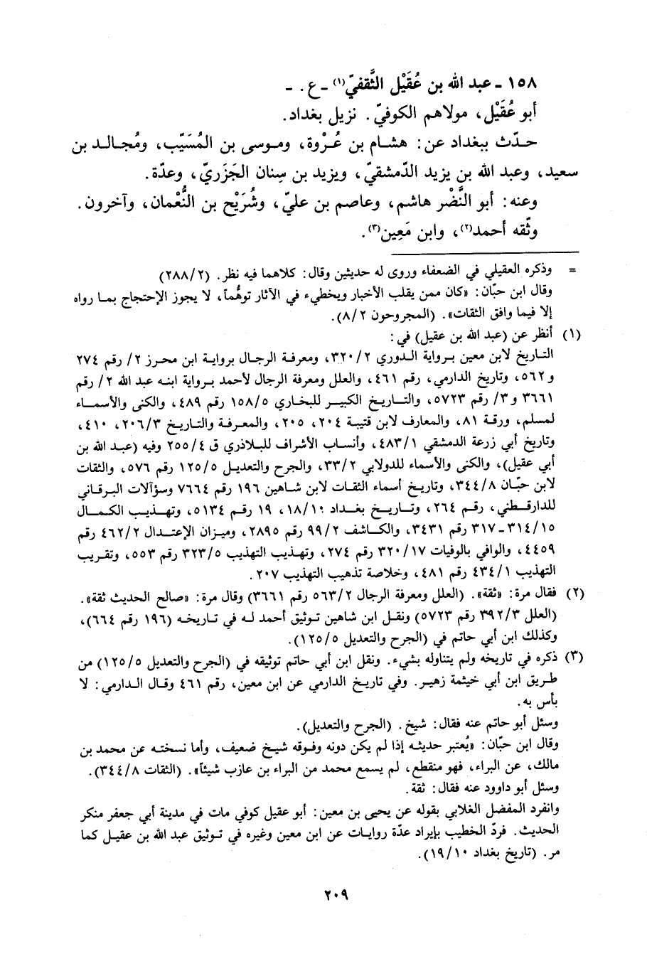 158- عبد الله بن عقيل الثّقفيّ [1]- ع. - أبو عقيل، مَوْلاهُمُ الْكُوفِيُّ. نَزِيلُ بَغْدَادَ.