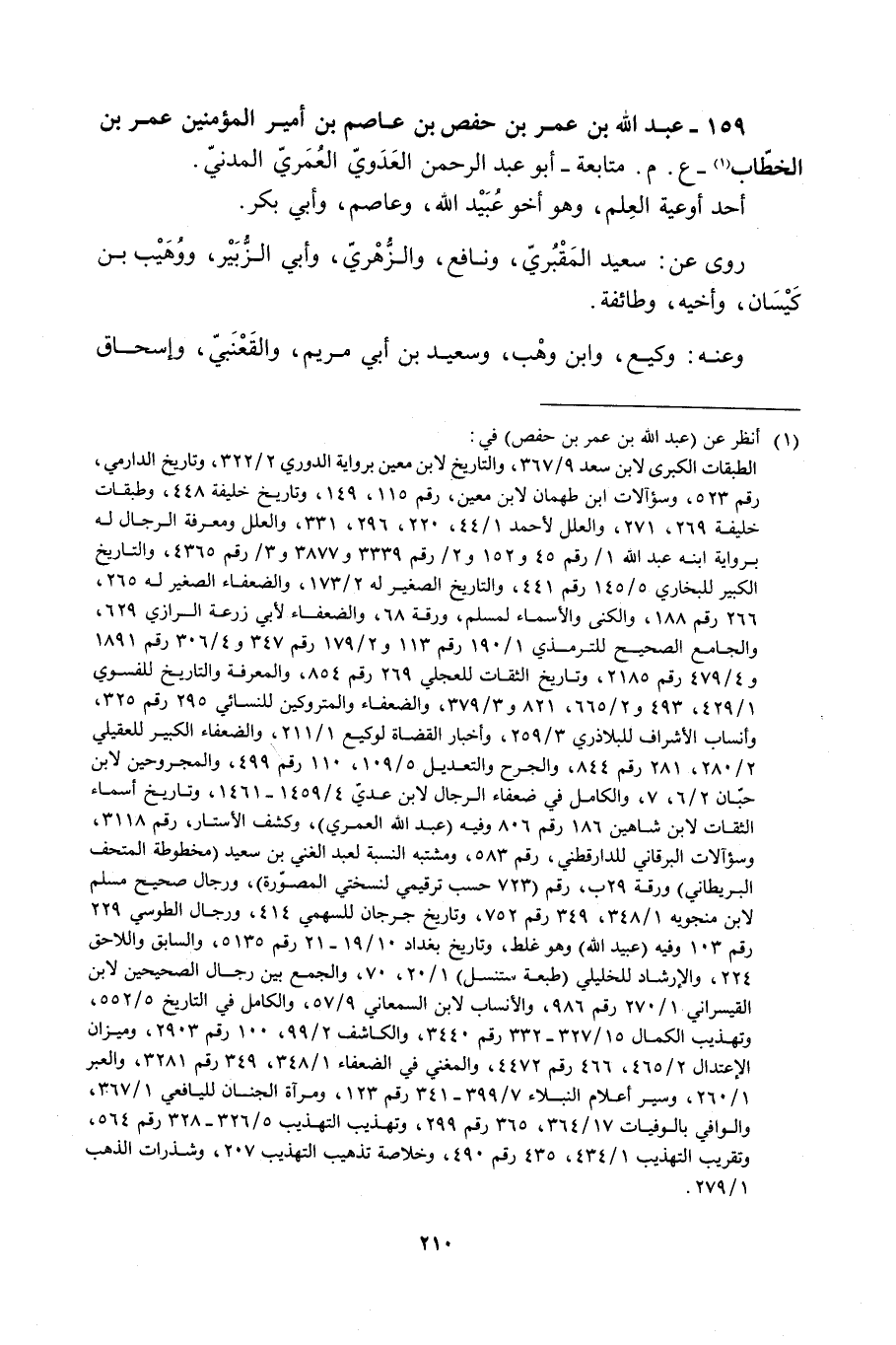 159- عبد الله بن عمر بن حفص بن عاصم بن أمير المؤمنين عمر بن الخطّاب [1]- ع. م. مُتَابَعَةً- أَبُو عَبْدِ الرَّحْمَنِ الْعَدَوِيُّ الْعُمَرِيُّ الْمَدَنِيُّ.