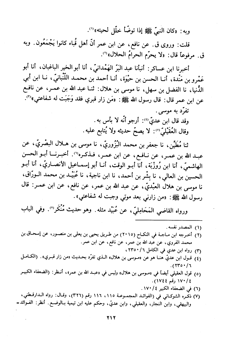 [4] قول ابن عديّ هنا هو عن «موسى بن هلال» الّذي تفرّد بحديث «من زار قبري» . (الكامل 6/ 2350) .