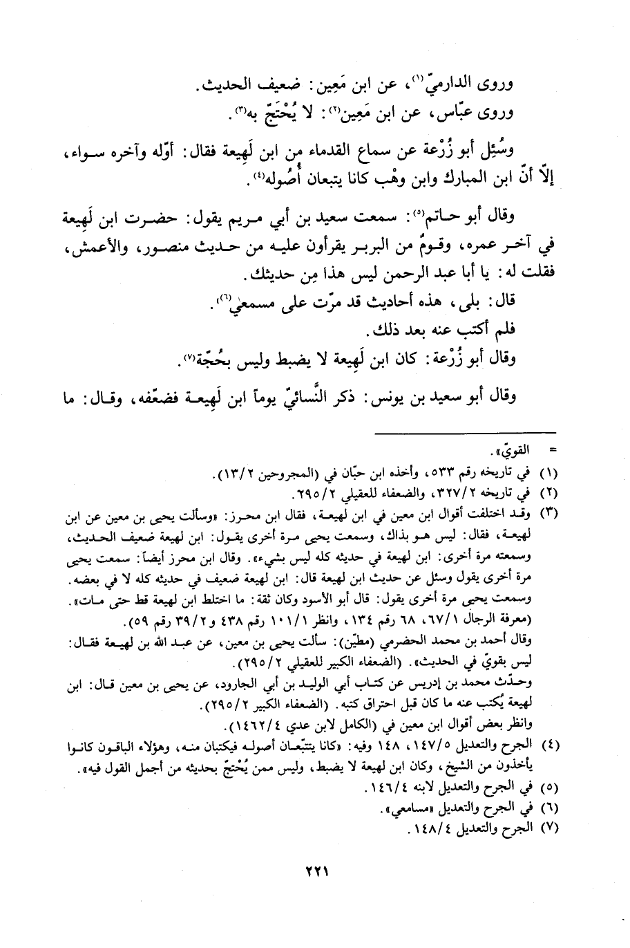 [4] الجرح والتعديل 5/ 147، 148 وفيه: «كانا يتتبعان أصوله فيكتبان منه، وهؤلاء الباقون كانوا يأخذون من الشيخ، وكان ابن لهيعة لا يضبط، وليس ممن يحتجّ بحديثه من أجمل القول فيه» .