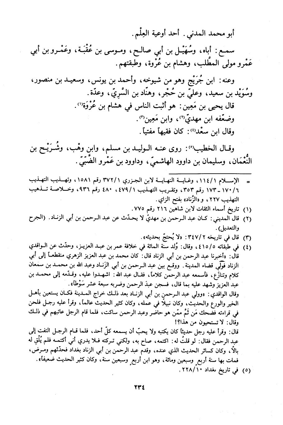[2] قال المديني: كان عبد الرحمن بن مهديّ لا يحدّث عن عبد الرحمن بن أبي الزناد. (الجرح والتعديل) .