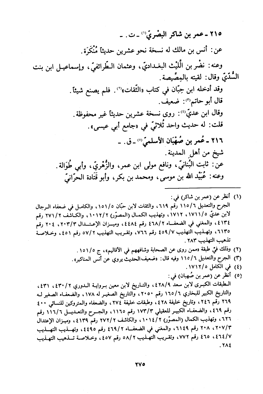 215- عُمَرُ بْنُ شَاكِرٍ الْبَصْرِيُّ [1]- ت. - عَنْ: أَنَسِ بْنِ مَالِكٍ لَهُ نُسْخَةٌ نَحْوَ عِشْرِينَ حَدِيثًا مُنْكَرَةٌ.