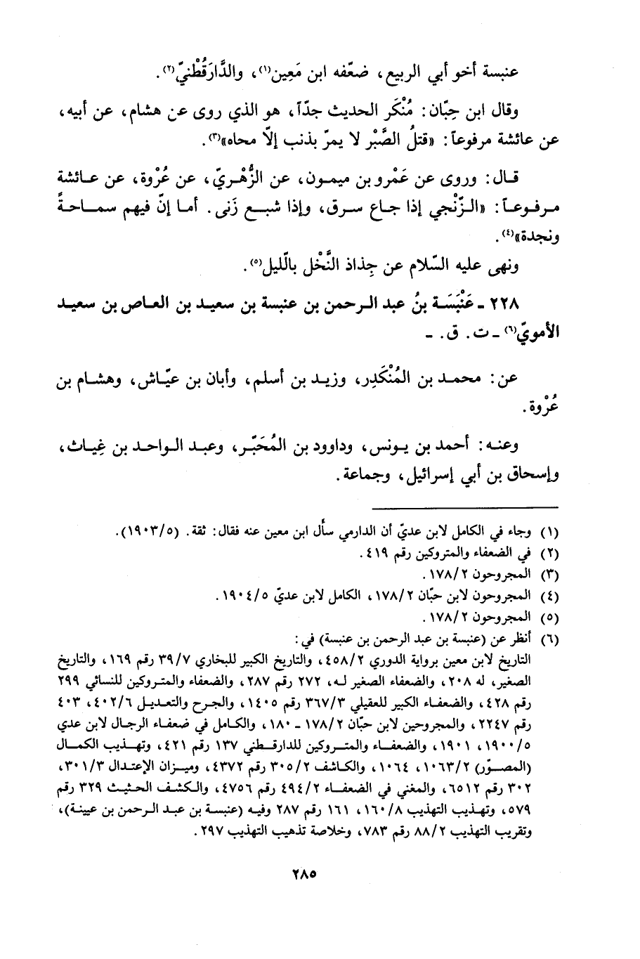 التاريخ لابن معين برواية الدوري 2/ 458، والتاريخ الكبير للبخاريّ 7/ 39 رقم 169، والتاريخ الصغير، له 208، والضعفاء الصغير له، 272 رقم 287، والضعفاء والمتروكين للنسائي 299 رقم 428، والضعفاء الكبير للعقيليّ 3/ 367 رقم 1405، والجرح والتعديل 6/ 402، 403 رقم 2247، والمجروحين لابن حبّان 2/ 178- 180، والكامل في ضعفاء الرجال لابن عدي 5/ 1900، 1901، والضعفاء والمتروكين للدار للدّارقطنيّ 137 رقم 421، وتهذيب الكمال (المصوّر) 2/ 1063، 1064، والكاشف 2/ 305 رقم 4372، وميزان الاعتدال 3/ 301، 302 رقم 6512، والمغني في الضعفاء 2/ 496 رقم 4756، والكشف الحثيث 329 رقم 579، وتهذيب التهذيب 8/ 160، 161 رقم 287 وفيه (عنبسة بن عبد الرحمن بن عيينة) ، وتقريب التهذيب 2/ 88 رقم 783، وخلاصة تذهيب التهذيب 297.