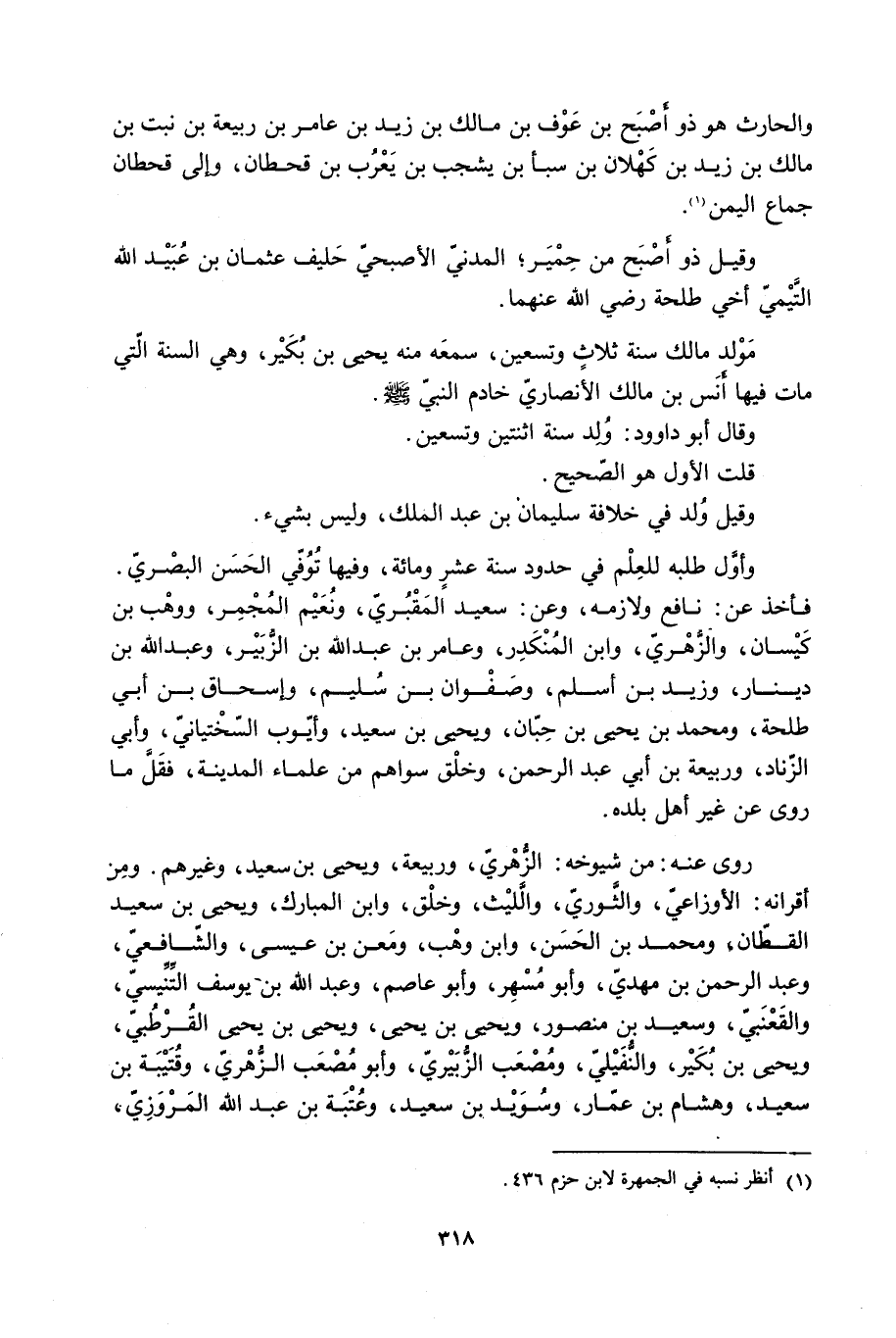 مَوْلِدُ مَالِكٍ سَنَةَ ثَلاثٍ وَتِسْعِينَ، سَمِعَهُ مِنْهُ يَحْيَى بْنُ بُكَيْرٍ، وَهِيَ السَّنَةُ الَّتِي مَاتَ فِيهَا أَنَسُ بْنُ مَالِكٍ الأَنْصَارِيُّ خَادِمُ النَّبِيِّ صَلَّى اللَّهُ عَلَيْهِ وَسَلَّمَ.