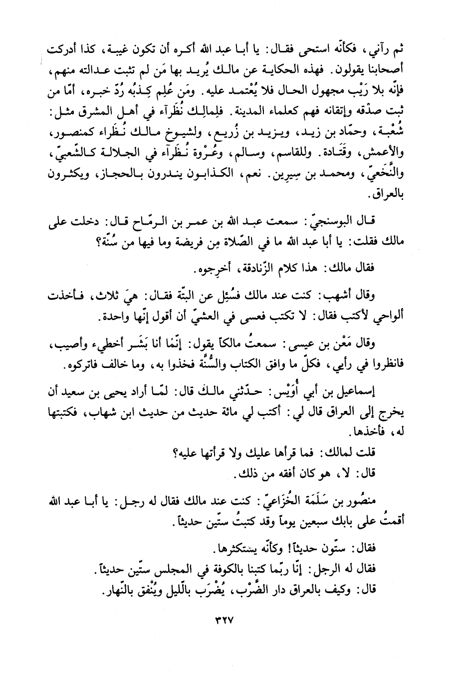 ثُمَّ رَآنِي، فَكَأَنَّهُ اسْتَحَى فَقَالَ: يَا أَبَا عَبْدِ اللَّهِ أَكْرَهُ أَنْ تَكُونَ غِيبَةً، كَذَا أَدْرَكْتُ أَصْحَابَنَا يَقُولُونَ. فَهَذِهِ الْحِكَايَةُ عَنْ مَالِكٍ يُرِيدُ بِهَا مَنْ لَمْ تَثْبُتْ عَدَالَتُهُ مِنْهُمْ، فَإِنَّهُ بِلا رَيْبٍ مَجْهُولُ الْحَالِ فَلا يُعْتَمَدُ عَلَيْهِ. وَمَنْ عُلِمَ كَذِبُهُ رُدَّ خَبَرُهُ، أَمَّا مَنْ ثَبُتَ صِدْقُهُ وَإِتْقَانُهُ فَهُمْ كَعُلَمَاءِ الْمَدِينَةِ. فَلِمَالِكٍ نُظَرَاءٌ فِي أَهْلِ الْمَشْرِقِ مِثْلُ: