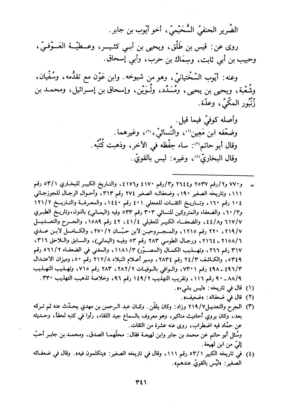 [ () ] و 770 و 2/ رقم 2537 و 2644 و 3/ رقم 4170 و 4176، والتاريخ الكبير للبخاريّ 1/ 53 رقم 111، وتاريخه الصغير 190، وضعفائه الصغير 274 رقم 313، وأحوال الرجال للجوزجانيّ 104 رقم 160، وتاريخ الثقات للعجلي 401 رقم 1440، والمعرفة والتاريخ 2/ 121 و 3/ 60، والضعفاء والمتروكين للنسائي 303 رقم 533 وفيه (اليماني) بالنون، وتاريخ الطبري 7/ 617 و 8/ 44، والضعفاء الكبير للعقيليّ 4/ 41، 42 رقم 1589، والجرح والتعديل 7/ 219، 220 رقم 1215، والمجروحين لابن حبّان 2/ 270، والكامل لابن عدي 6/ 2158- 2164، ورجال الطوسي 283 رقم 53 وفيه (اليماني) ، والسابق واللاحق 316، 317 رقم 266، وتهذيب الكمال (المصوّر) 3/ 1181، والمغني في الضعفاء 2/ 561 رقم 5349، والكاشف 3/ 24 رقم 2834، وسير أعلام النبلاء 8/ 212 رقم 50، وميزان الاعتدال 3/ 496- 498 رقم 7301، والوافي بالوفيات 2/ 282، 283 رقم 715، وتهذيب التهذيب 9/ 88- 90 رقم 116، وتقريب التهذيب 2/ 149 رقم 96، وخلاصة تذهيب التهذيب 330.