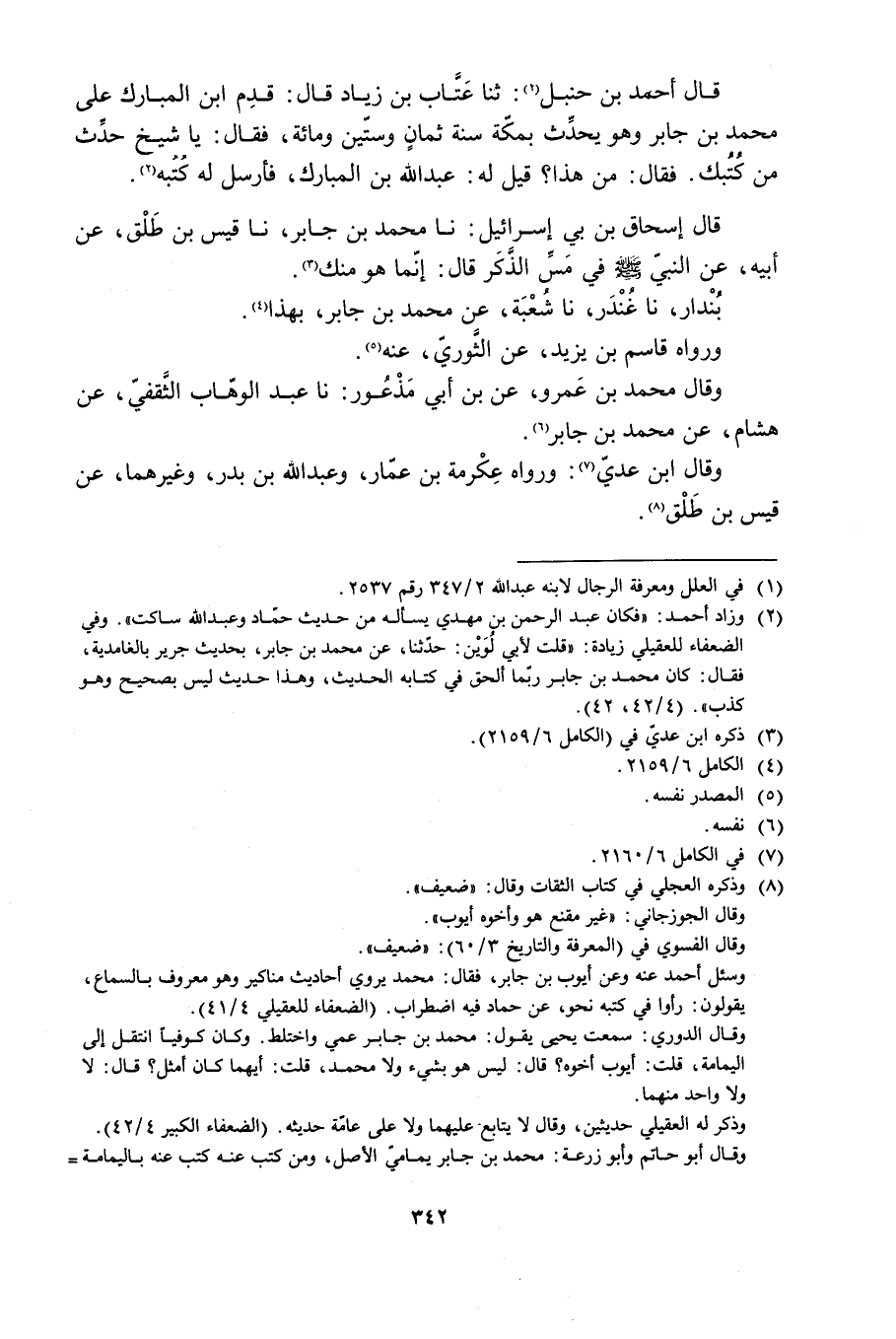 قَالَ أَحْمَدُ بْنُ حَنْبَلٍ [1] : ثَنَا عَتَّابُ بْنُ زِيَادٍ قَالَ: قَدِمَ ابْنُ الْمُبَارَكِ عَلَى مُحَمَّدِ بْنِ جَابِرٍ وَهُوَ يُحَدِّثُ بِمَكَّةَ سَنَةَ ثَمَانٍ وَسِتِّينَ وَمِائَةٍ، فَقَالَ: يَا شَيْخُ حَدِّثْ مِنْ كُتُبِكَ. فَقَالَ: مَنْ هَذَا؟ قِيلَ لَهُ: عَبْدُ اللَّهِ بْنُ الْمُبَارَكِ، فَأَرْسَلَ لَهُ كُتُبَهُ [2] .