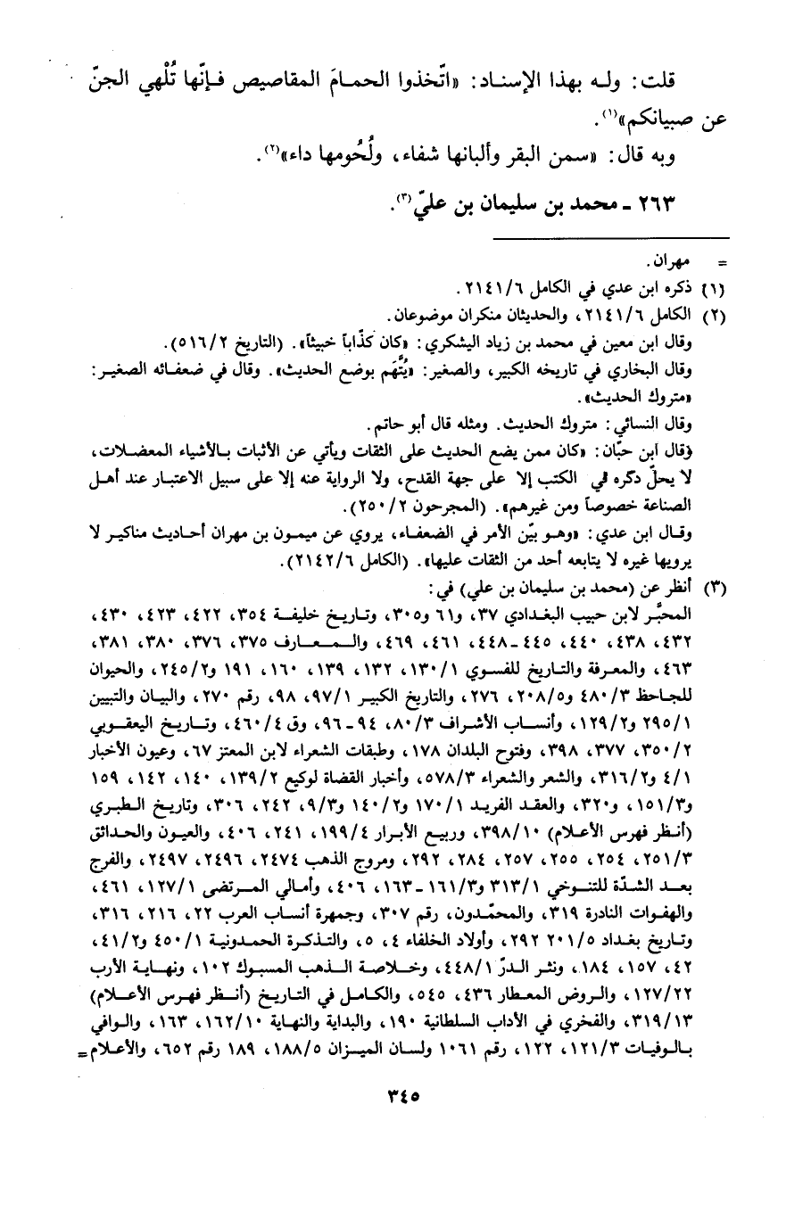 وَبِهِ قَالَ: «سَمْنُ الْبَقَرِ وَأَلْبَانُهَا شِفَاءٌ، وَلُحُومُهَا دَاءٌ» [2] . 263- مُحَمَّدُ بن سليمان بن عليّ [3] .