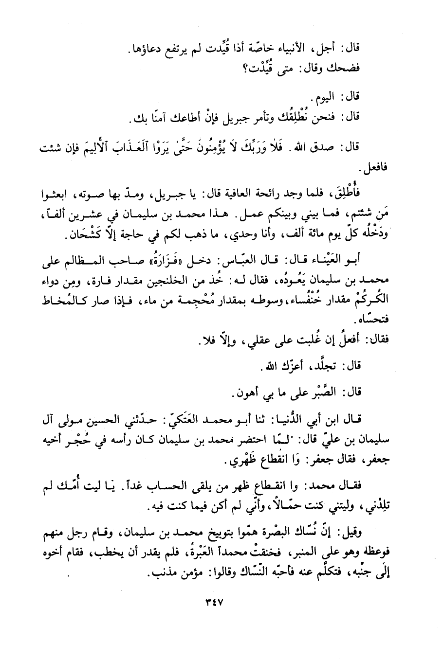فَأُطْلِقَ، فَلَمَّا وَجَدَ رَائِحَةَ الْعَافِيَةِ قَالَ: يَا جِبْرِيلُ، وَمَدَّ بِهَا صَوْتَهُ، ابْعَثُوا مَنْ شِئْتُمْ، فَمَا بَيْنِي وَبَيْنَكُمْ عَمَلٌ. هَذَا مُحَمَّدُ بْنُ سُلَيْمَانَ فِي عِشْرِينَ أَلْفًا، وَدَخْلُهُ كُلُّ يَوْمٍ مِائَةُ أَلْفٍ، وَأَنَا وَحْدِي، مَا ذَهَبَ لَكُمْ فِي حَاجَةٍ إِلا كَشْحَانُ.