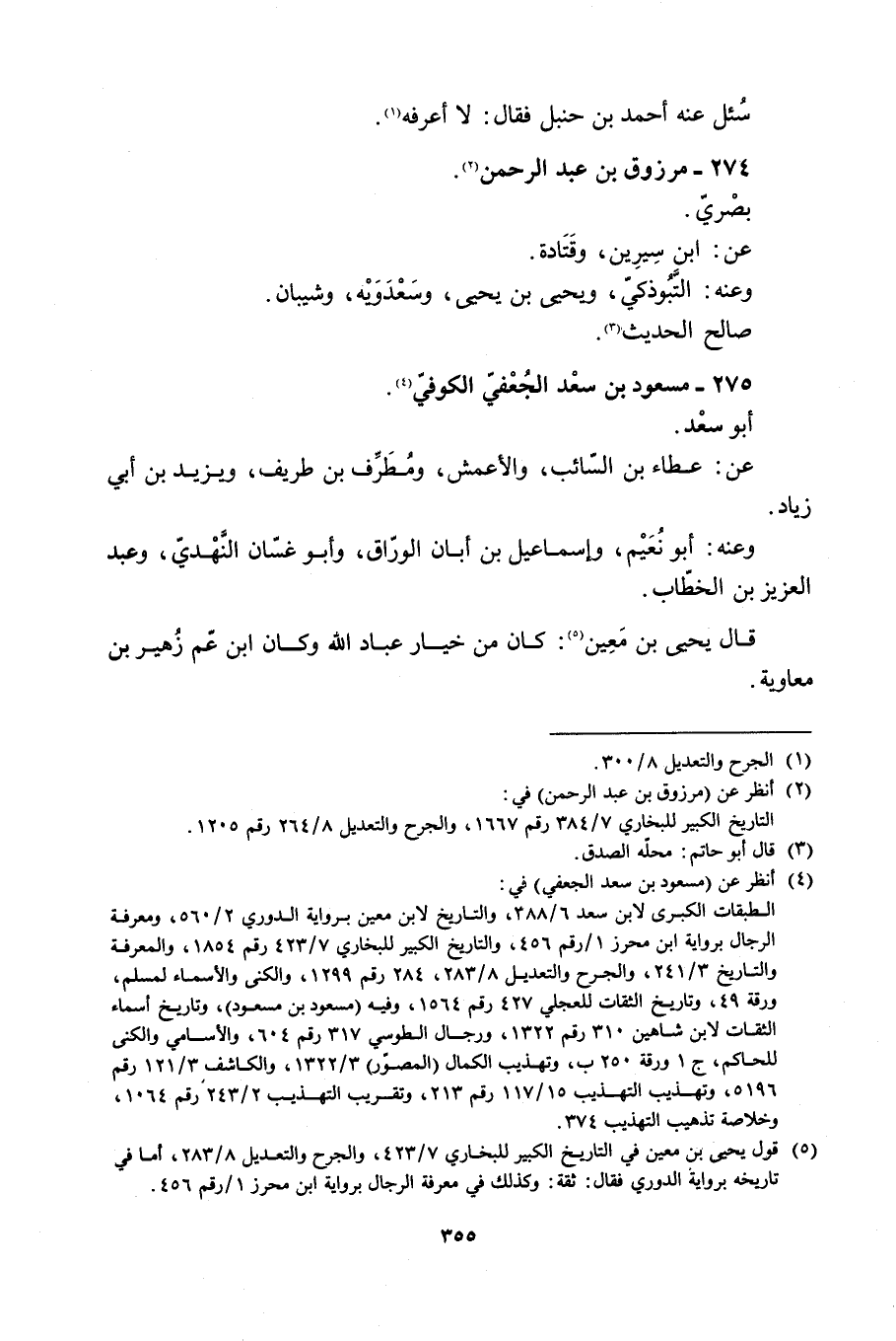 [5] قول يحيى بن معين في التاريخ الكبير للبخاريّ 7/ 423، والجرح والتعديل 8/ 283، أما في تاريخه برواية الدوري فقال: ثقة: وكذلك في معرفة الرجال برواية ابن محرز 1/ رقم 456.