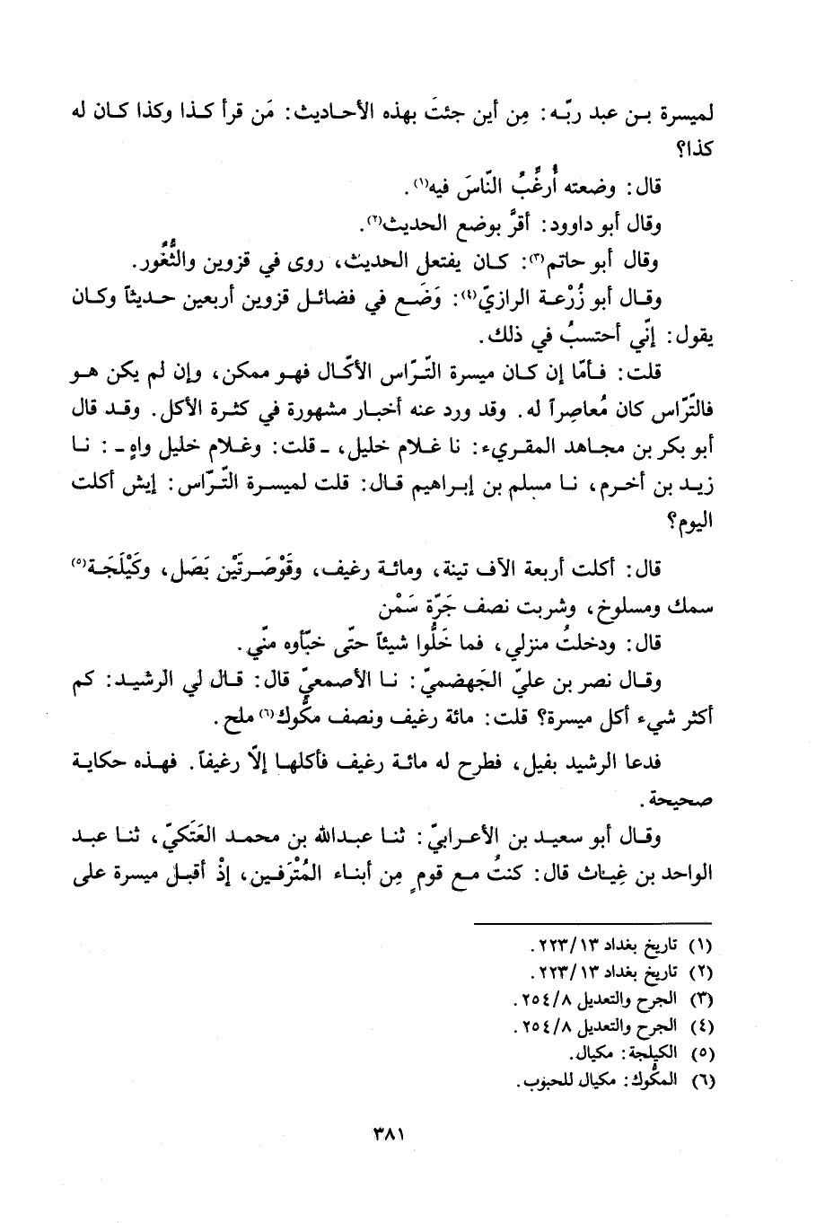 وَقَالَ نَصْرُ بْنُ عَلِيٍّ الْجَهْضَمِيُّ: نَا الأَصْمَعِيُّ قَالَ: قَالَ لِيَ الرَّشِيدُ: كَمْ أَكْثَرَ شَيْءٍ أَكَلَ مَيْسَرَةُ؟ قُلْتُ: مِائَةَ رَغِيفٍ وَنِصْفَ مَكُّوكٍ [6] مِلْحٍ.