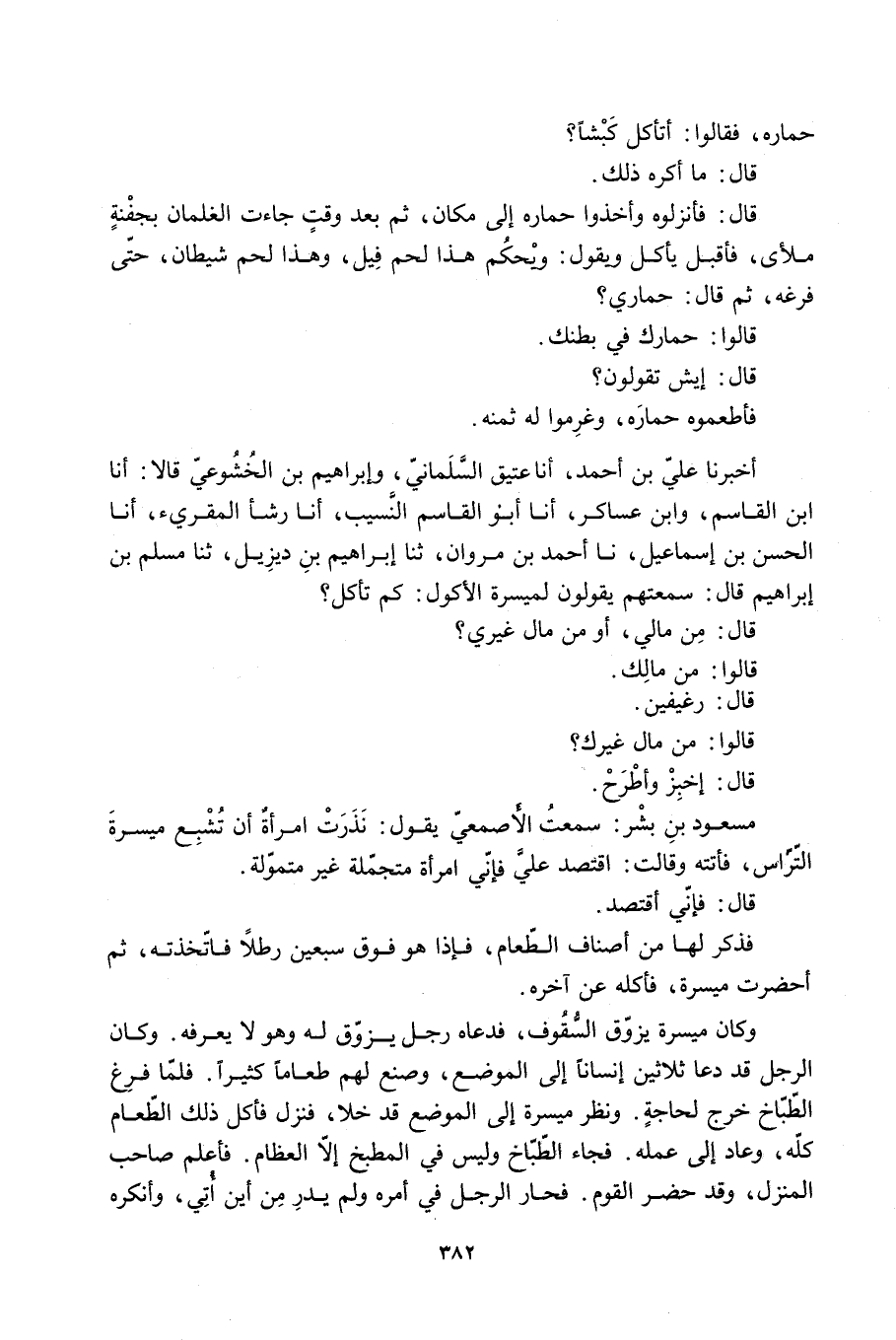 قَالَ: فَأَنْزَلُوهُ وَأَخَذُوا حِمَارَهُ إِلَى مَكَانٍ، ثُمَّ بَعْدَ وَقْتٍ جَاءَتِ الْغِلْمَانُ بِجَفْنَةٍ مَلأَى، فَأَقْبَلَ يَأْكُلُ وَيَقُولُ: وَيْحَكُمْ هَذَا لَحْمُ فِيلٍ، وَهَذَا لَحْمُ شَيْطَانَ، حَتَّى فَرَّغَهُ، ثُمَّ قَالَ: حِمَارِي؟