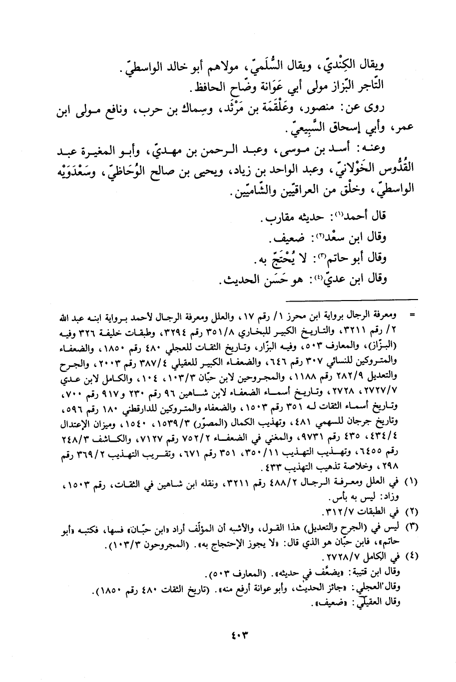 [3] ليس في (الجرح والتعديل) هذا القول، والأشبه أن المؤلّف أراد «ابن حبّان» فسها، فكتبه «أبو حاتم» ، فابن حبّان هو الّذي قال: «لا يجوز الاحتجاج به» . (المجروحون 3/ 103) .