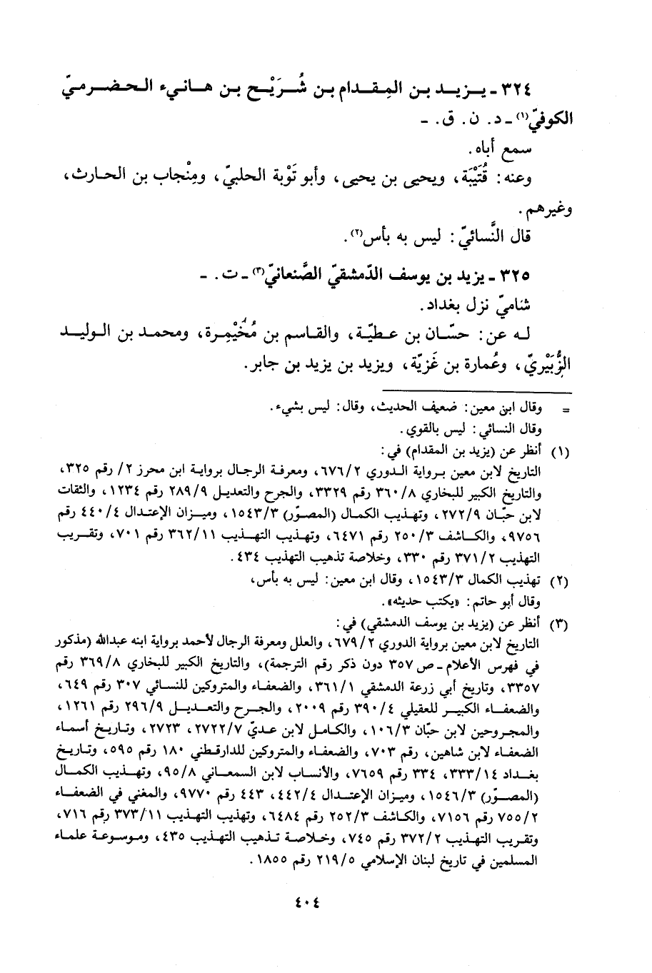 324- يَزِيدُ بْنُ الْمِقْدَامِ بْنِ شُرَيْحِ بْنِ هَانِئٍ الْحَضْرَمِيُّ الْكُوفِيُّ [1]- د. ن. ق. - سَمِعَ أَبَاهُ.