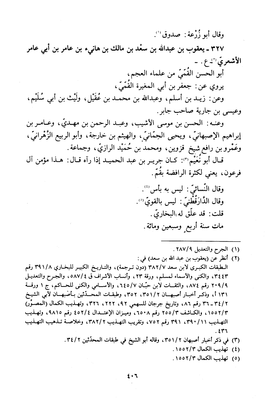 327- يَعْقُوبُ بْنُ عَبْدِ اللَّهِ بْنِ سَعْدِ بْنِ مَالِكِ بْنِ هَانِئِ بن عامر بن أبي عامر الأشعريّ [2]- ع. - أبو الحسن القمّيّ مِنْ عُلَمَاءِ الْعَجَمِ، يَرْوِي عَنْ: جَعْفَرِ بْنِ أبي المغيرة القمّيّ، وعن: زيد بْنِ أَسْلَمَ، وَعَبْدِ اللَّهِ بْنِ مُحَمَّدِ بْنِ عُقَيْلٍ، وَلَيْثِ بْنِ أَبِي سُلَيْمٍ، وَعِيسَى بْنِ جَارِيَةَ صَاحِبِ جَابِرٍ.