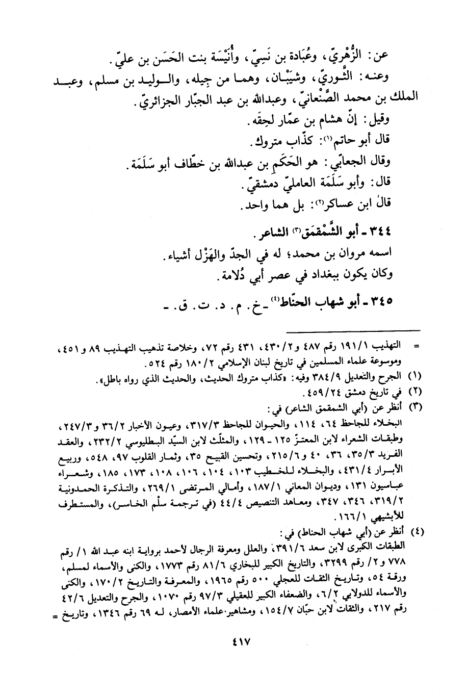 [1] التهذيب 1/ 191 رقم 487 و 2/ 430، 431 رقم 72، وخلاصة تذهيب التهذيب 89 و 451، وموسوعة علماء المسلمين في تاريخ لبنان الإسلامي 2/ 180 رقم 524.