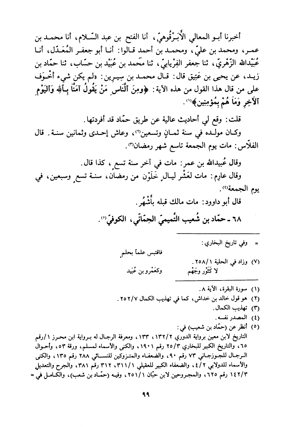 أَخْبَرَنَا أَبُو الْمَعَالِي الأَبَرْقُوهِيُّ، أَنَا الْفَتْحُ بْنُ عَبْدِ السَّلامِ، أَنَا مُحَمَّدُ بْنُ عُمَرَ، وَمُحَمَّدُ بْنُ عَلِيٍّ، وَمُحَمَّدُ بْنُ أَحْمَدَ قَالُوا: أَنَا أَبُو جَعْفَرٍ الْمُعَدَّلِ، أَنَا عُبَيْدُ اللَّهِ الزُّهْرِيُّ، ثَنَا جَعْفَرٌ الْفِرْيَابِيُّ، ثَنَا محمد بن عبيد بن حساب، ثنا حماد بْنُ زَيْدٍ، عَنْ يَحْيَى بْنِ عَتِيقٍ قَالَ: قَالَ مُحَمَّدُ بْنُ سِيرِينَ: «لَمْ يَكُنْ شَيْءٌ أَخْوَفَ عَلَى مَنْ قَالَ هَذَا الْقَوْلِ مِنْ هَذِهِ الآيَةِ: وَمن النَّاسِ مَنْ يَقُولُ آمَنَّا بِاللَّهِ وَبِالْيَوْمِ الْآخِرِ وَما هُمْ بِمُؤْمِنِينَ 2: 8 [2] .