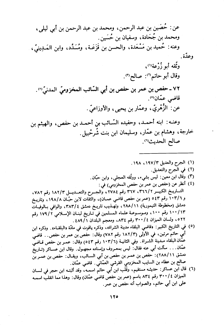 [6] قال ابن عساكر: حديثه مستقيم، وقلب ابن أبي حاتم اسمه، وقد أثبته ابن حجر في لسان الميزان 4/ 300 رقم 834 باسم (عمر بن حفص قاضي عمّان) وقال: وهذا مما انقلب اسمه على ابن أبي حاتم، والصواب أنه حفص بن عمر.