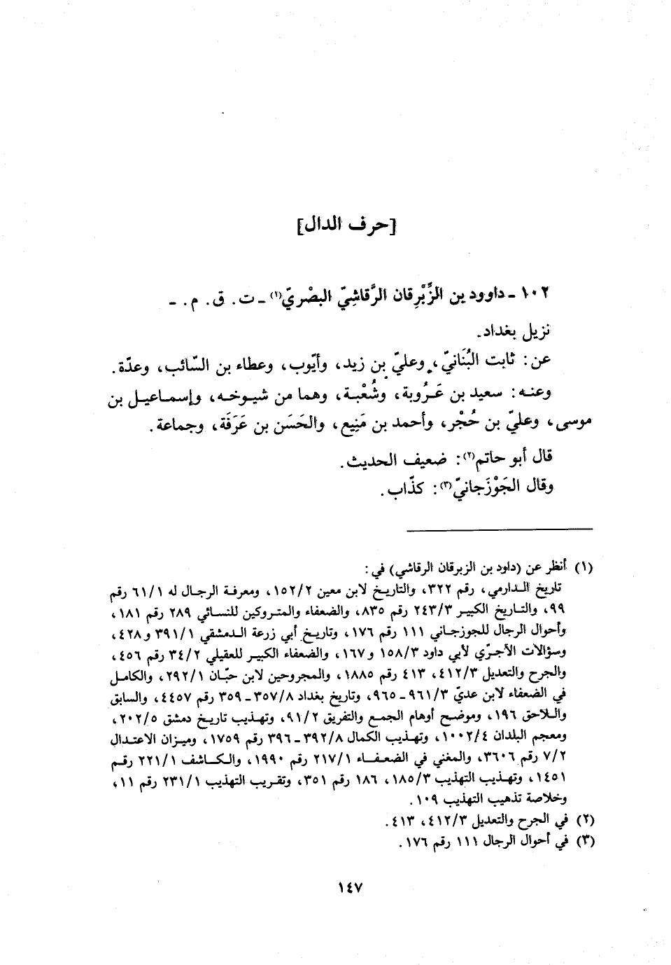 102- دَاوُدُ بْنُ الزِّبْرِقَانِ الرَّقَاشِيُّ الْبَصْرِيُّ [1]- ت. ق. م. - نَزِيلُ بَغْدَادَ.