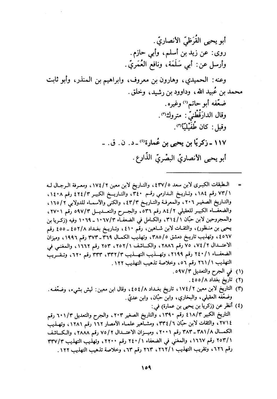 117- زكريا بن يحيى بن عمارة [4]- د. ن. ق. - أبو يحيى الأنصاريّ البصريّ الذّارع.