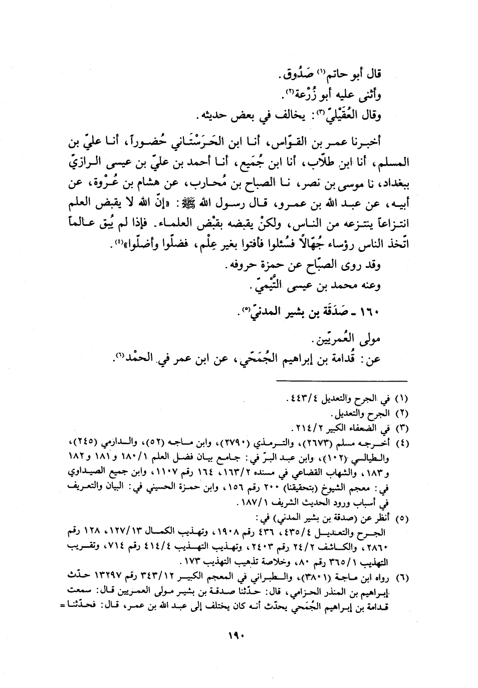أَخْبَرَنَا عُمَرُ بْنُ الْقَوَّاسِ، أَنَا ابْنُ الْحَرَسْتَانِيِّ حُضُورًا، أنا عَلِيُّ بْنُ الْمُسْلِمِ، أَنَا ابْنُ طَلابٍ، أَنَا ابْنُ جُمَيْعٌ، أَنَا أَحْمَدُ بْنُ عَلِيِّ بْنِ عِيسَى الرَّازِيُّ بِبَغْدَادَ، نا مُوسَى بْنُ نَصْرٍ، نا الصَّبَاحُ بْنُ مُحَارِبٍ، عَنْ هِشَامِ بْنِ عُرْوَةَ، عَنْ أَبِيهِ، عَنْ عَبْدِ اللَّهِ بْنِ عَمْرٍو، قَالَ رَسُولُ اللَّهِ صَلَّى اللَّهُ عَلَيْهِ وَسَلَّمَ: «إِنَّ اللَّهَ لَا يَقْبِضُ الْعِلْمَ انْتِزَاعًا يَنْتَزِعُهُ مِنَ النَّاسِ، وَلَكِنْ يَقْبِضُهُ بِقَبْضِ الْعُلَمَاءِ. فَإِذَا لَمْ يُبْقِ عَالِمًا اتَّخَذَ النَّاسُ رُؤَسَاءَ جُهَّالًا فَسُئِلُوا فَأَفْتَوْا بِغَيْرِ عِلْمٍ، فَضَلُّوا وَأَضَلُّوا» [4] . وَقَدْ رَوَى الصَّبَّاحُ عَنْ حَمْزَةَ حُرُوفَهُ.