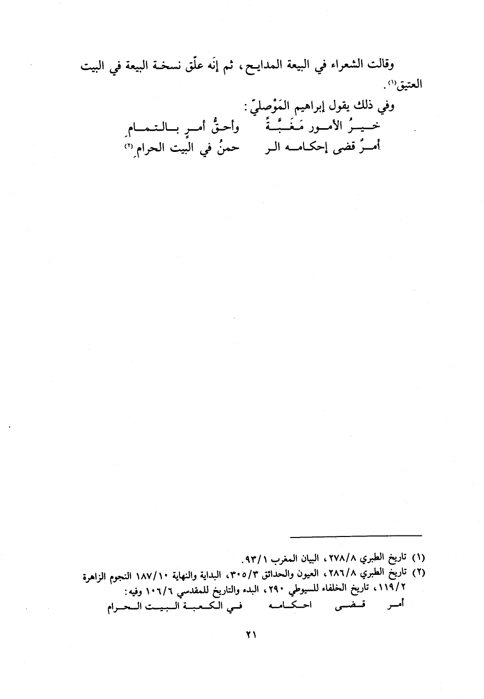 [2] تاريخ الطبري 8/ 286، العيون والحدائق 3/ 305، البداية والنهاية 10/ 187 النجوم الزاهرة 2/ 119، تاريخ الخلفاء للسيوطي 290، البدء والتاريخ للمقدسي 6/ 106 وفيه: