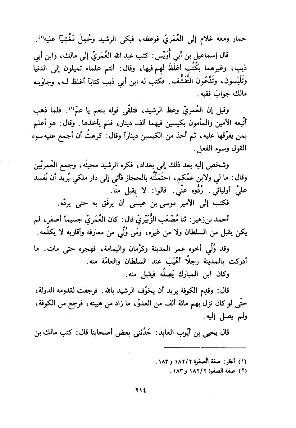 وشخص إليه بعد ذلك إلى بغداد، فكره الرشيد مجيئَه، وجمع العمريّين وقال: ما لي ولابن عمْكم، احتَمَلْتُه بالحجاز فأتى إلى دار ملكي يُريد أن يُفسد عليّ أوليائي. رُدُّوه عنّي. قالوا: لا يقبل منّا.