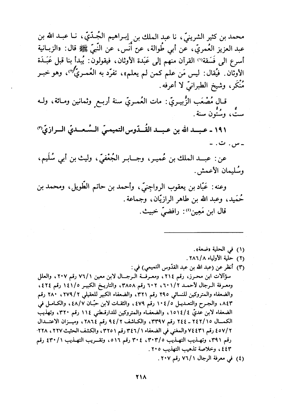 191- عبد الله بن عبد القُدّوس التّميميّ السَّعديّ الرّازيّ [3]- س. ت. - عن: عبد الملك بن عُمَيْر، وجابر الْجُعْفيّ، وليث بن أبي سُلَيم، وسُليمان الأعمش.