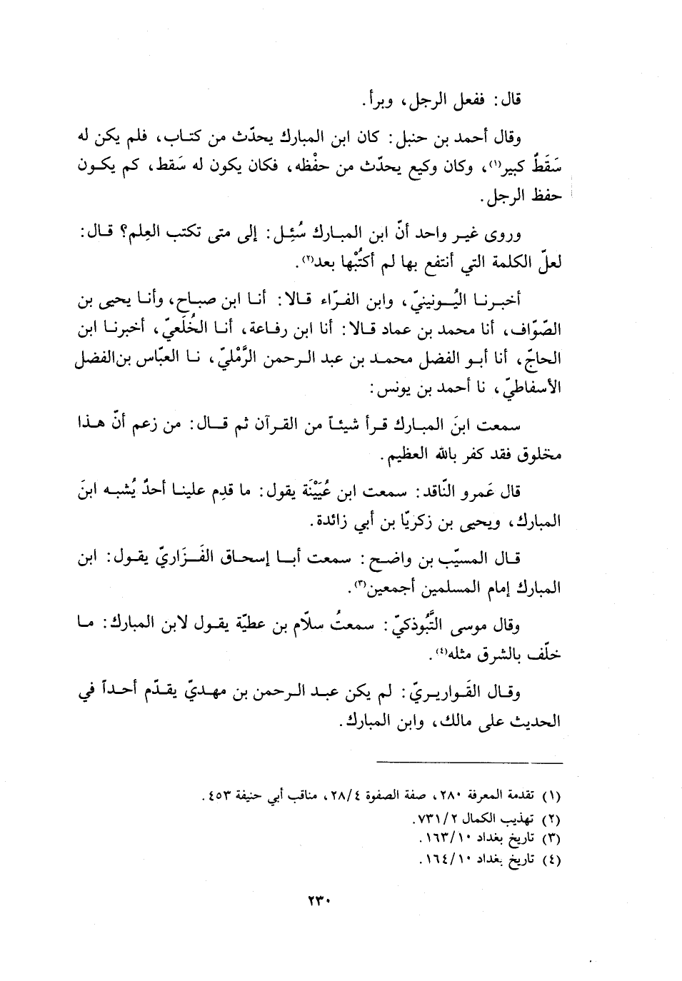 قال المسيب بن واضح: سمعتُ أبا إسحاق الفَزَاريّ يقول: ابن المبارك إمام المسلمين أجمعين [3] .