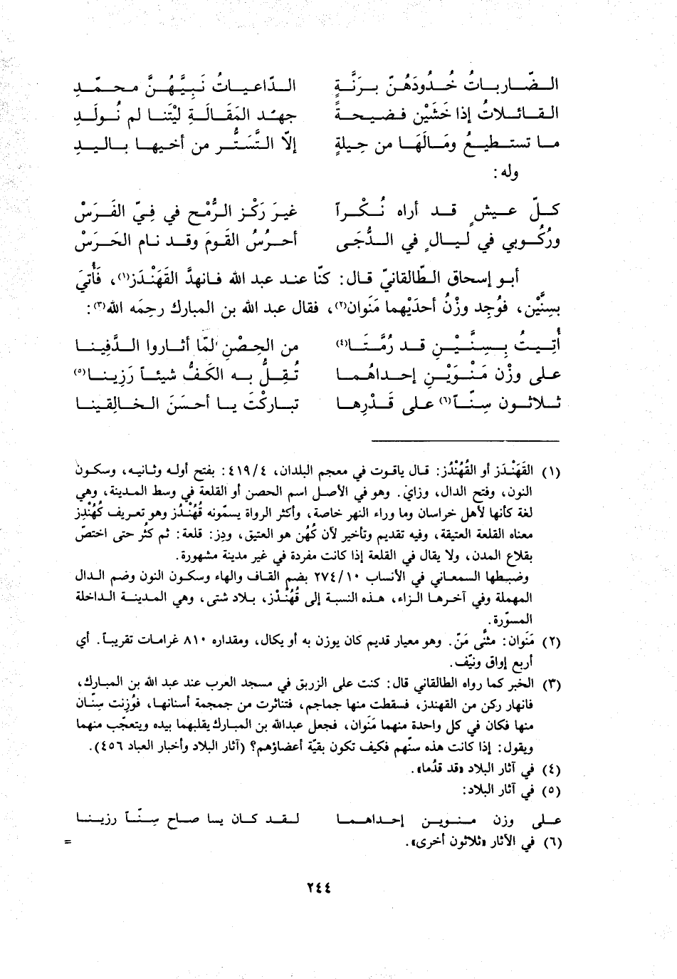 أبو إسحاق الطّالقانيّ قال: كنّا عند عبد الله فانهدّ القهندز [1] ، فأتي بسنّين، فوجد وزن إحداهما مَنَوان [2] ، فقال عبد الله بن المبارك رحِمَه الله [3] :
