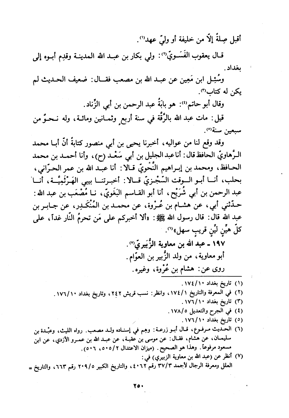 حَدَّثَنِي أَبِي، عَنْ هِشَامِ بْنِ عُرْوَةَ، عَنْ مُحَمَّدِ بْنِ الْمُنْكَدِرِ، عَنْ جَابِرِ بْنِ عَبْدِ اللَّهِ قَالَ: قَالَ رسول صَلَّى اللَّهُ عَلَيْهِ وَسَلَّمَ: «أَلا أُخْبِرُكُمْ عَلَى مَنْ تَحْرُمُ النَّارُ غَدًا، عَلَى كُلِّ هَيِّنٍ لَيِّنٍ قَرِيبٍ سَهْلٍ» [6] . 197- عبد الله بن معاوية الزُّبَيريّ [7] .