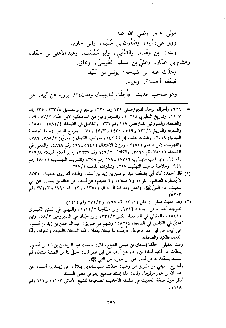 أخرجه أحمد في المسند 2/ 97، وابن ماجة 2/ 1102، والبيهقي في السنن الكبرى 1/ 254، والعقيلي في الضعفاء الكبير 2/ 331، وابن حبّان في المجروحين 2/ 58، وابن عديّ في الكامل في الضعفاء 4/ 1582 وكلهم من طريق: عبد الرحمن بن زيد بن أسلم، عن أبيه، عن ابن عمر مرفوعا: «أحلّت لنا ميتتان ودمان، فأما الميتتان فالحوت والجراد، وأمّا الدمان فالكبد والطحال» . وعند العقيلي: حدّثنا إسحاق بن عيسى الطباع، قال: سمعت عبد الرحمن بن زيد بن أسلم، يحدّث عن أخيه أسامة بن زيد، عن أبيه، عن ابن عمر قال: أحلّ لنا من الميتة ميتتان، ثم سمعته يحدّث به عن أبيه، عن ابن عمر، عن النبي صلّى الله عليه وسلّم.