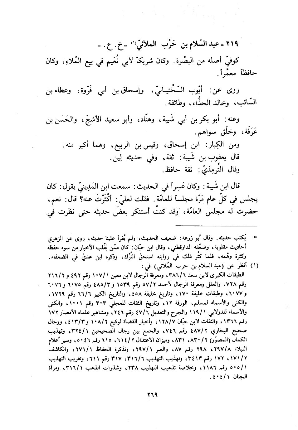 219- عبد السلام بن حرب الملائي [1]- خ. ع. - كوفيّ أصله من البصرة. وكان شريكًا لأبي نُعَيم في بيع الْمُلاءِ، وكان حافظًا معمِّرًا.