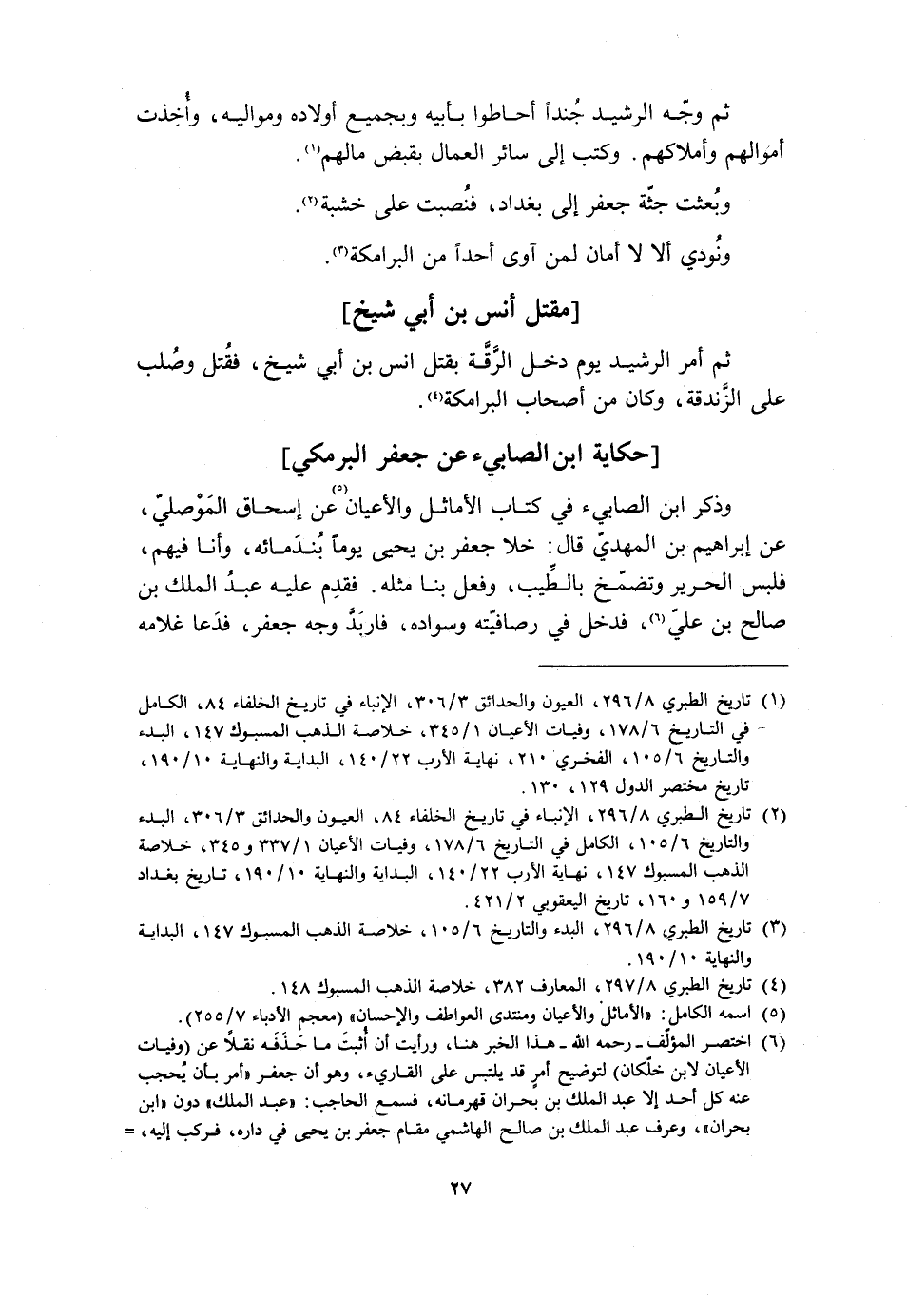 [6] اختصر المؤلّف- رحمه الله- هذا الخبر هنا، ورأيت أن أثبت ما حذفه نقلا عن (وفيات الأعيان لابن خلّكان) لتوضيح أمر قد يلتبس على القارئ، وهو أن جعفر «أمر بأن يحجب عنه كل أحد إلا عبد الملك بن بحران قهرمانه، فسمع الحاجب: «عبد الملك» دون «ابن بحران» ، وعرف عبد الملك بن صالح الهاشمي مقام جعفر بن يحيى في داره، فركب إليه،