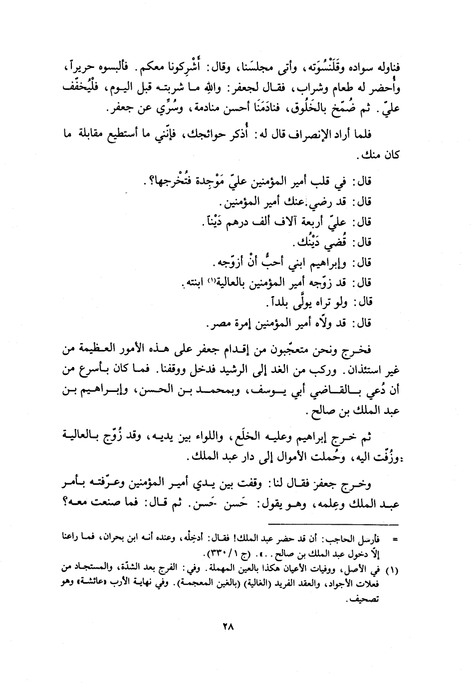 [ () ] فأرسل الحاجب: أن قد حضر عبد الملك! فقال: أدخله، وعنده أنه ابن بحران، فما راعنا إلّا دخول عبد الملك بن صالح..» . (ج 1/ 330) .