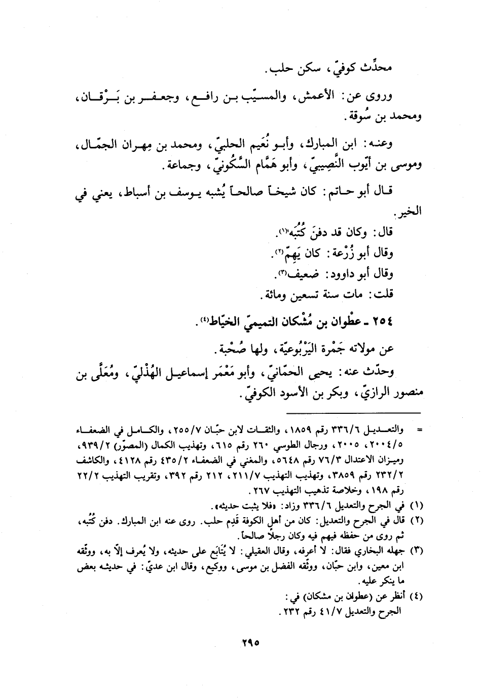 [2] قال في الجرح والتعديل: كان من أهل الكوفة قدم حلب. روى عنه ابن المبارك. دفن كتبه، ثم روى من حفظه فيهم فيه وكان رجلا صالحا.