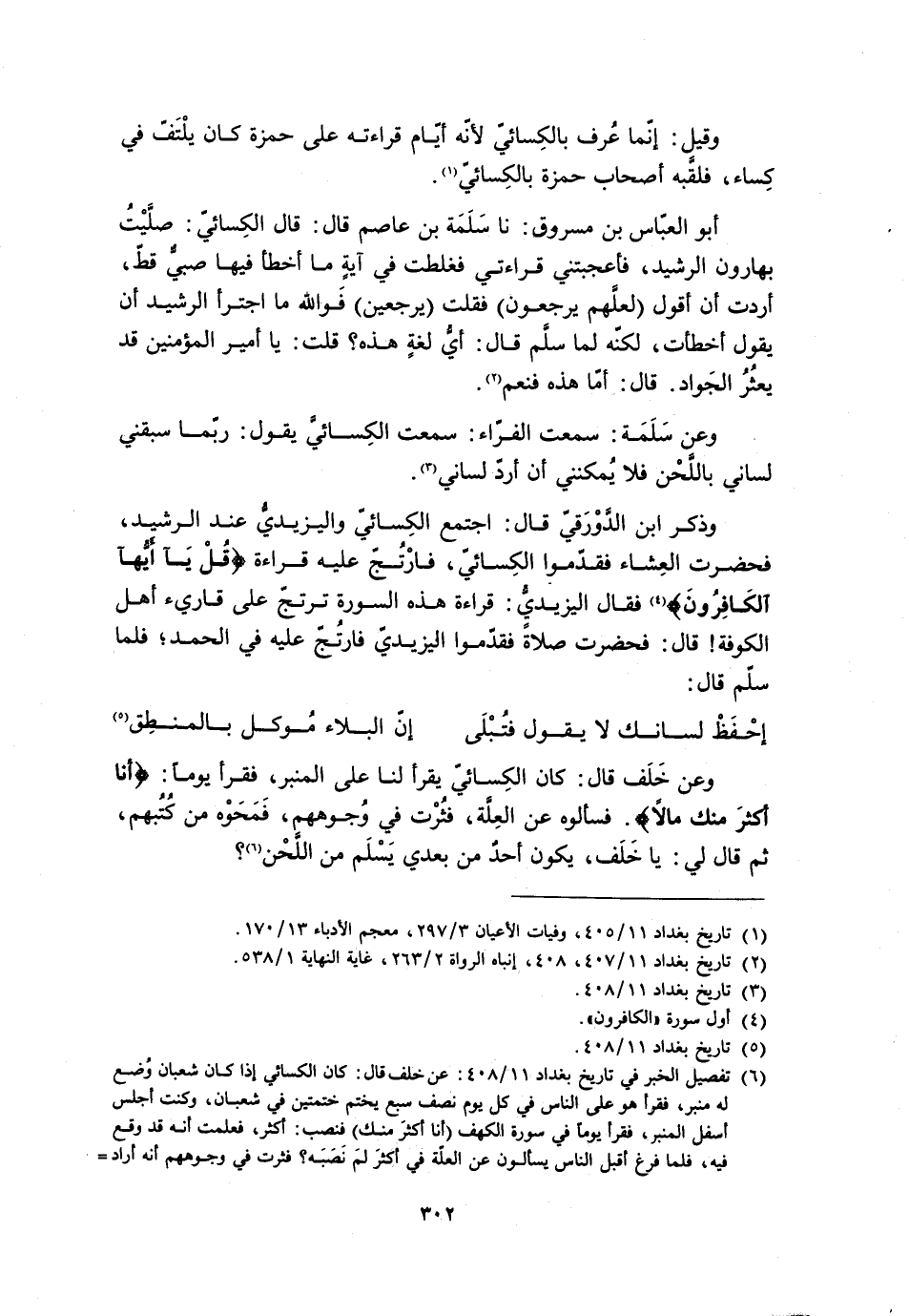 [6] تفصيل الخبر في تاريخ بغداد 11/ 408: عن خلف قال: كان الكسائي إذا كان شعبان وضع له منبر، فقرأ هو على الناس في كل يوم نصف سبع يختم ختمتين في شعبان، وكنت أجلس أسفل المنبر، فقرأ يوما في سورة الكهف (أنا أكثر منك) فنصب: أكثر، فعلمت أنه قد وقع فيه، فلما فرغ أقبل الناس يسألون عن العلّة في أكثر لم نصبه؟ فثرت في وجوههم أنه أراد-