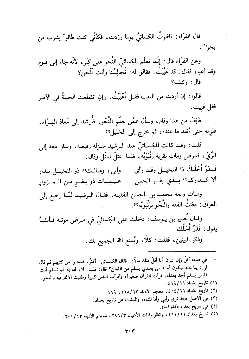 [5] تاريخ بغداد 11/ 414، وانظر وفيات الأعيان 3/ 296، معجم الأدباء 13/ 200.