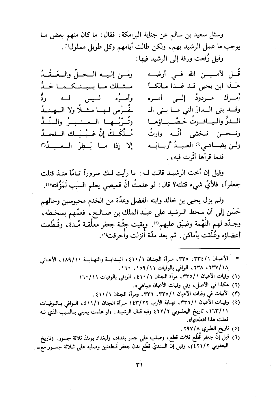 [4] وفيات الأعيان 1/ 336، نهاية الأرب 22/ 143 مرآة الجنان 1/ 411، الوافي بالوفيات 11/ 163، تاريخ اليعقوبي 2/ 422 وفيه قال الرشيد: «لو علمت يميني بالسبب الّذي له فعلت هذا لقطعتها» .