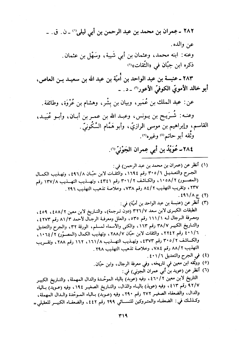 ذكره ابن حِبّان في «الثقات» [2] 283- عنبسة بن عبد الواحد بن أُميّة بْن عَبْد اللَّه بْن سَعِيد بْن العاص، أبو خالد الأمويّ الكوفيّ الأعور [3]- د. - عن: عبد الملك بن عُمَيْر، وبيان بن بِشْر، وهشام بن عُرْوة، وطائفة.