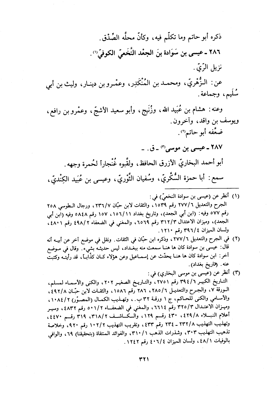 [2] في الجرح والتعديل 6/ 277، وذكره ابن حبّان في الثقات. ونقل في موضع آخر عن أبيه أنه قال: عيسى بن سوادة كان ها هنا سمعت منه ببغداد، ليس حديثه بشيء. وقال في موضع آخر: ابن سوادة كان هاهنا يحدّث عن إسماعيل وعن هؤلاء كان كذّابا، قد رأيته وكتبت عنه. (تاريخ بغداد) .