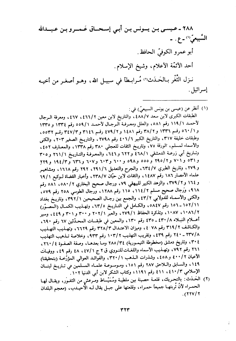288- عيسى بن يونس بْن أَبِي إسحاق عَمْرو بْن عَبْد الله السّبيعيّ [1]- ع. - أبو عمرو الكوفيّ الحافظ.