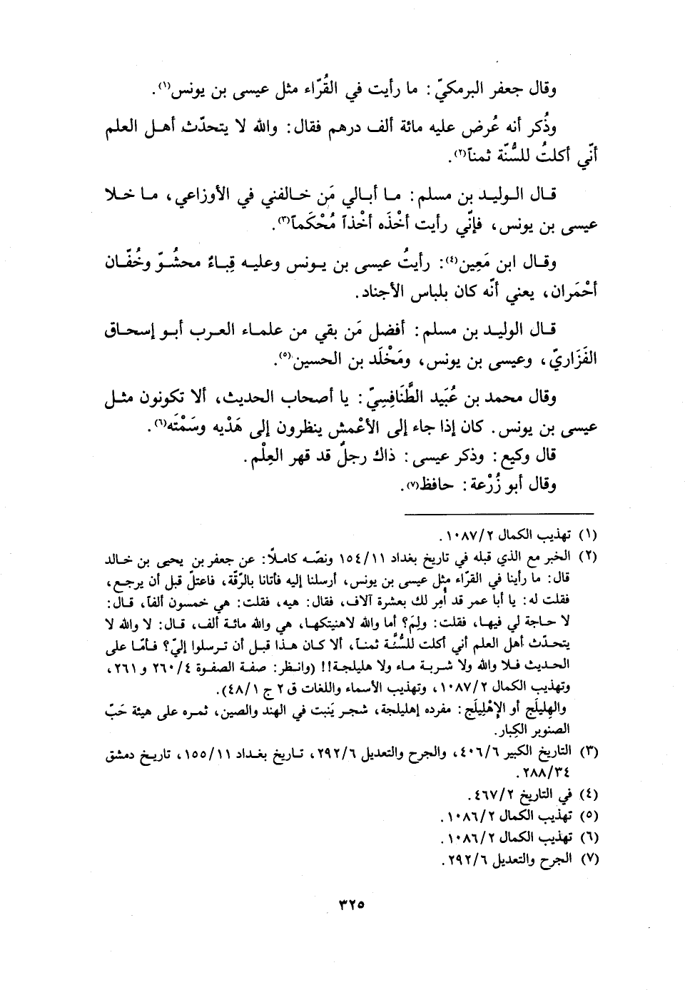 [2] الخبر مع الّذي قبله في تاريخ بغداد 11/ 154 ونصّه كاملا: عن جعفر بن يحيى بن خالد قال: ما رأينا في القرّاء مثل عيسى بن يونس، أرسلنا إليه فأتانا بالرّقّة، فاعتلّ قبل أن يرجع، فقلت له: يا أبا عمر قد أمر لك بعشرة آلاف، فقال: هيه، فقلت: هي خمسون ألفا، قال: