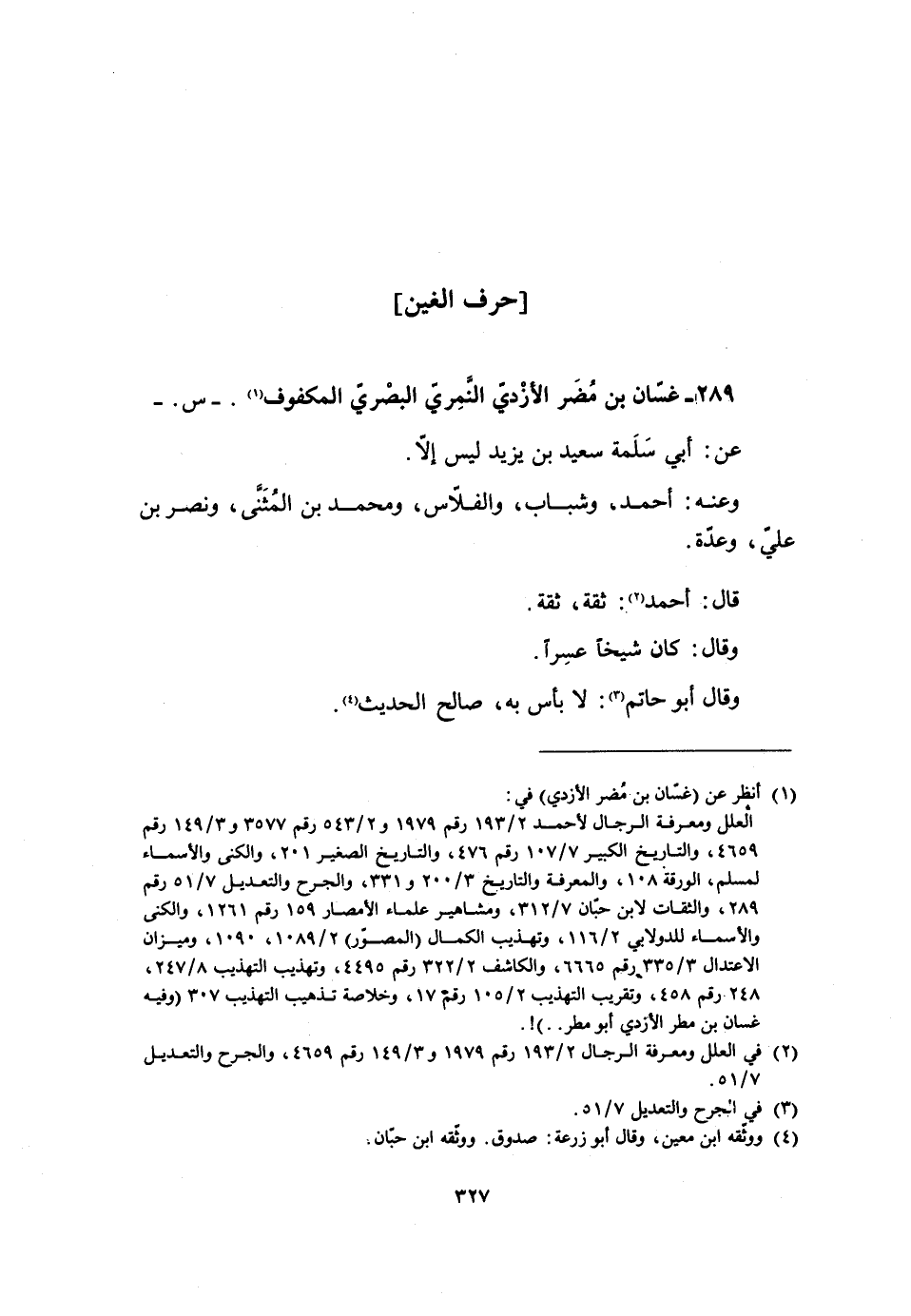 289- غسان بن مُضَر الأزْديّ النَّمِريّ البصْريّ المكفوف [1] . - س. - عن: أبي سَلَمة سعيد بن يزيد ليس إلا.