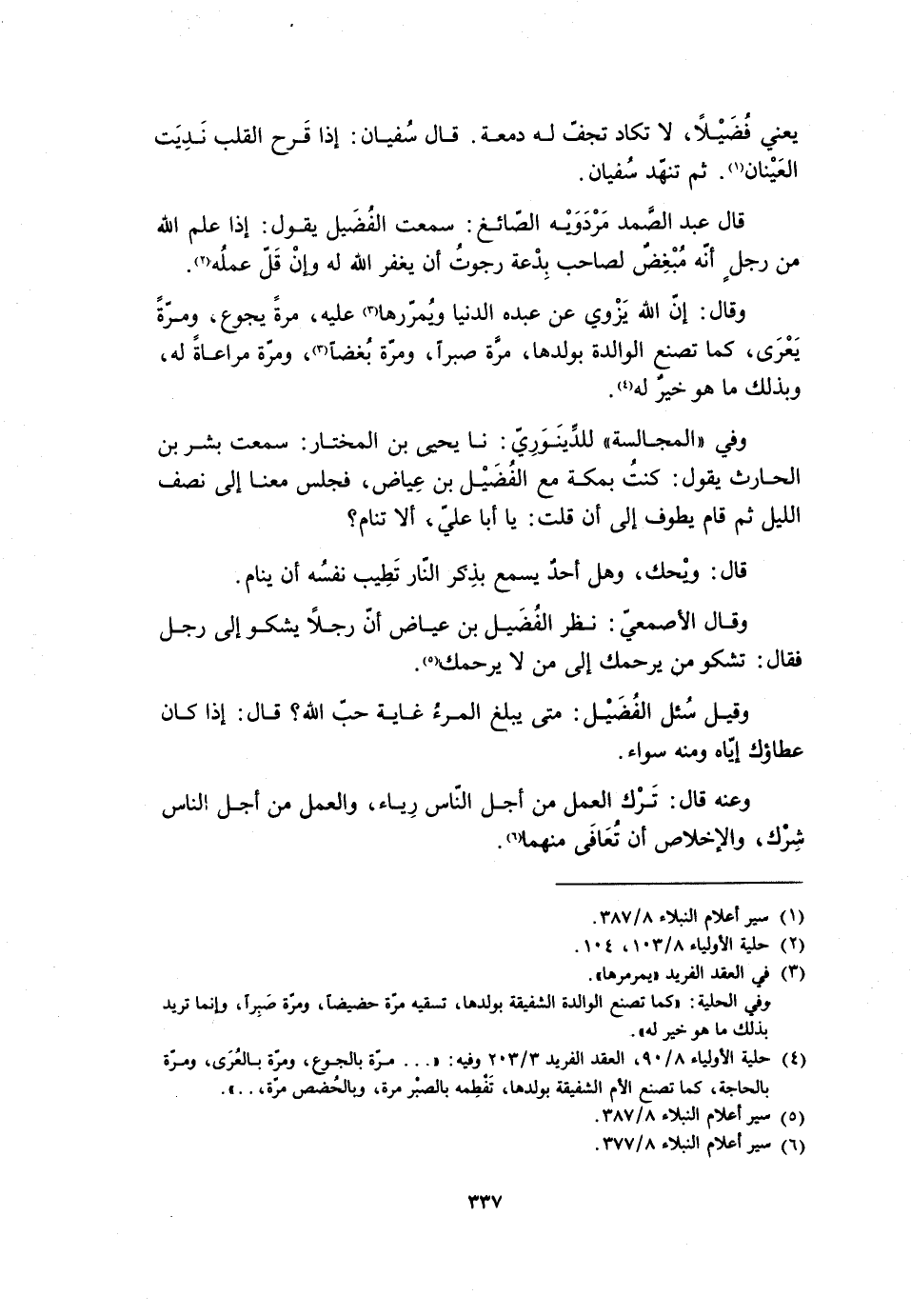 وفي «المجالسة» للدِّيَنَوَرِيّ: نا يحيى بن المختار: سمعتُ بِشْر بن الحارث يقول: كنتُ بمكة مع الْفُضَيْلِ بن عِياض، فجلس معنا إلى نصف الليل ثمّ قام يطوف إلى أن قلت: يا أبا عليّ، ألا تنام؟
