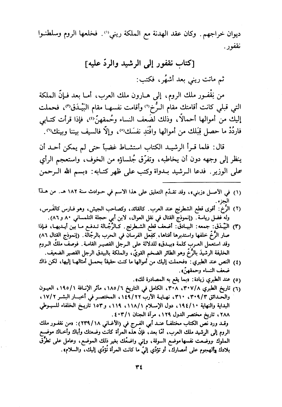 مِنْ نِقْفُورَ مَلِكِ الرُّومِ، إِلَى هَارُونَ مَلِكِ الْعَرَبِ، أَمَّا بَعْدُ فَإِنَّ الْمَلِكَةَ الَّتِي قَبْلِي كَانَتْ أَقَامَتْكَ مَقَامَ الرُّخِ [2] وَأَقَامَتْ نَفْسَهَا مَقَامَ الْبَيْدَقِ [3] ، فَحَمَلَتْ إِلَيْكَ مِنْ أَمْوَالِهَا أَحْمَالا، وَذَلِكَ لِضَعْفِ النِّسَاءِ وَحُمْقِهِنَّ [4] ، فَإِذَا قَرَأْتَ كِتَابِي فَارْدُدْ مَا حَصَلَ قِبَلَكَ مِنْ أَمْوَالِهَا وَافْتَدِ نَفْسَكَ [5] ، وَإِلا فَالسَّيْفُ بَيْنَنَا وَبَيْنَكَ [6] .