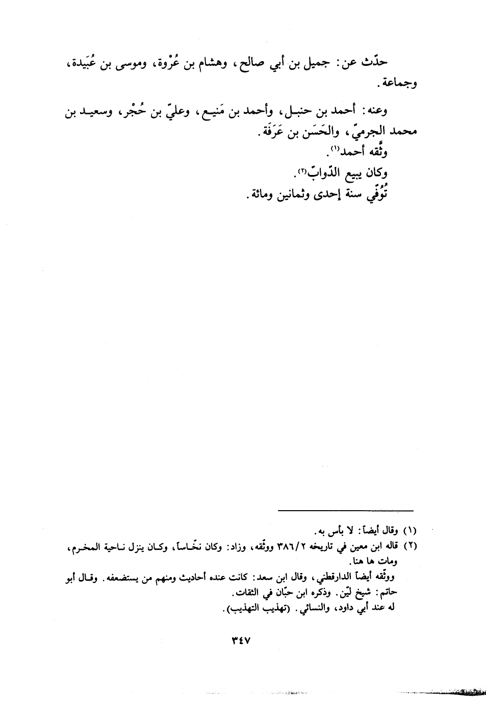 [2] قاله ابن معين في تاريخه 2/ 386 ووثّقه، وزاد: وكان نخّاسا، وكان ينزل ناحية المخرم، ومات هاهنا.