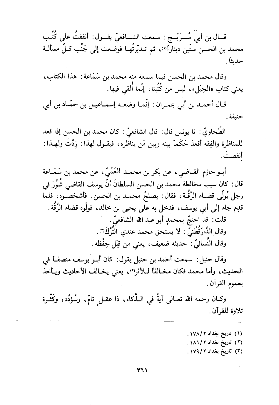 قال بن أبي سُرَيْج: سمعتُ الشّافعيّ يقول: أنفقتُ عَلَى كُتُب محمد بْن الحَسَن ستين دينارًا [1] ، ثمّ تدبرتُها فوضعت إلى جَنْب كلّ مسألة حديثًا.