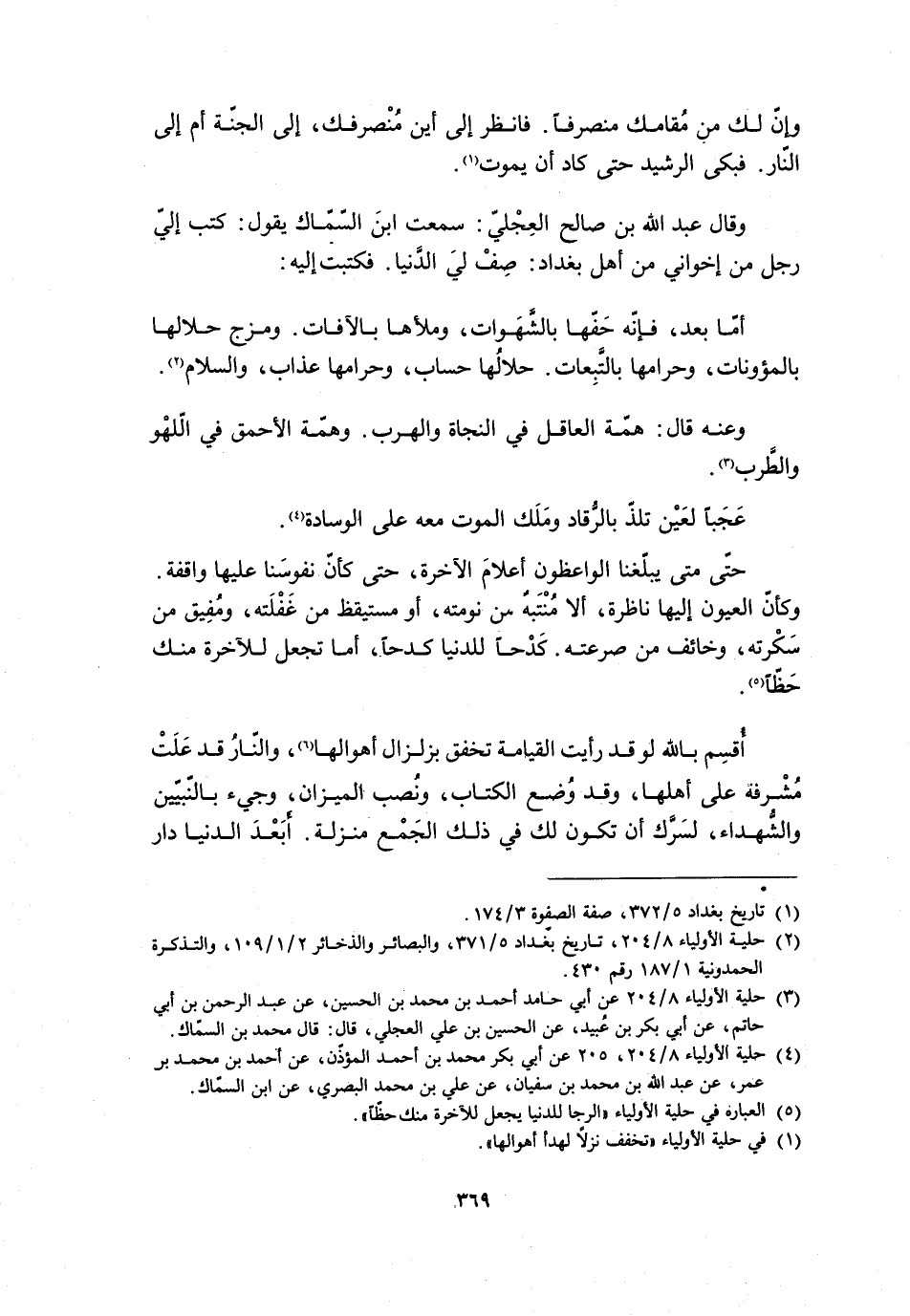 [2] حلية الأولياء 8/ 204، تاريخ بغداد 5/ 371، والبصائر والذخائر 2/ 1/ 109، والتذكرة الحمدونية 1/ 187 رقم 430.